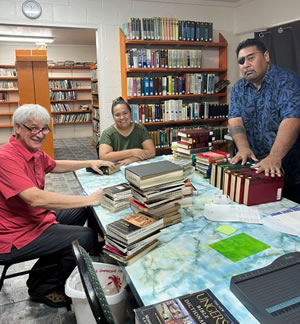 Glenna and I spent 3 weeks in Pago Pago, American Samoa at the Samoa Leadership Bible College. Talk about hospitality, food, scenery, and opportunities. Many thanks to Megan Fiti, President Della Fuimaono, Linda, Tino, Olloz and so many others. What a place. While Glenna figured out the system they used and got the computers set up to network, I touched all the books and weeded out those that were unnecessary to the curriculum, worn out copies, and duplicates. This reduced the library by about 2,000 copies. I also repaired hundreds of books. Talked theology and life experience with Tino while eating snack upon snack. I think the final tally came to 2,200 books processed with about 4,000 to go. Tino and Olloz came up with authors and titles for 4WRD to locate and ship later. 4WRD has 2 pallets of books waiting to ship as we are still finding more and working on some needed periodicals. This will more than make up for the 2,000 books weeded.